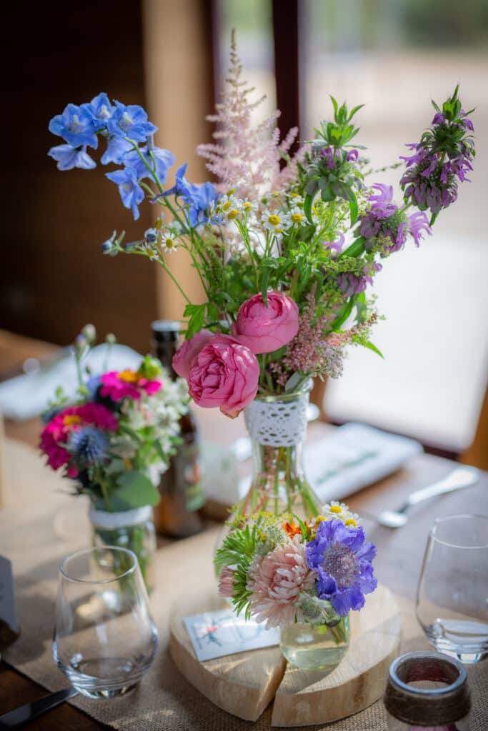 Les fleurs sont choisies de saison et locales, souvent disposées de manière libre, presque sauvage, pour donner l’impression d’un jardin spontané.