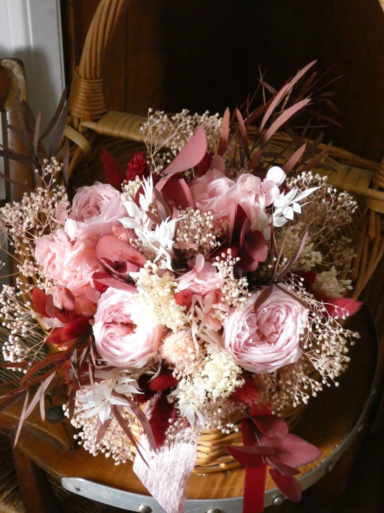 Bouquet rond de fleurs champêtres dans les coloris rose pastel et bordeaux : rose ancienne stabilisée rose pâle, eucalyptus, gypsophile et hortensia pour ce bouquet composé par votre fleuriste.