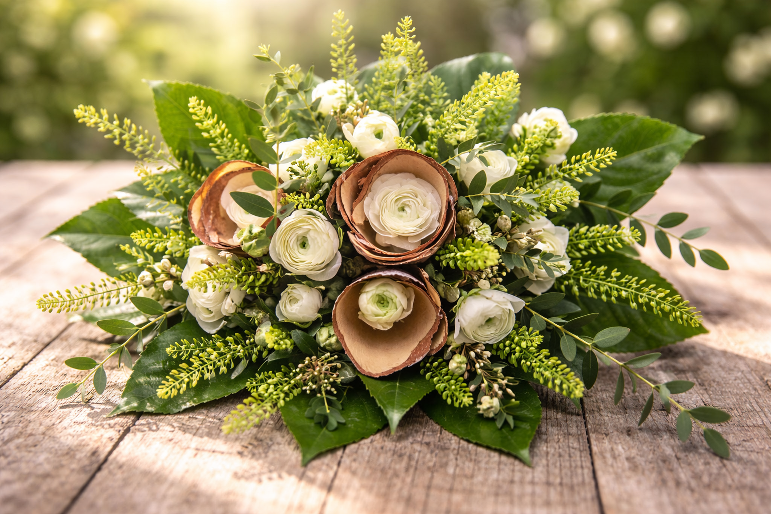 Il est sublimé par un mélange de feuillages d’eucalyptus, de graminées légères et d’une touche d’écorces de bouleau, apportant relief, texture et un esprit résolument naturel.