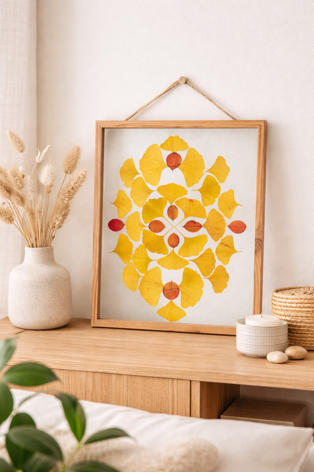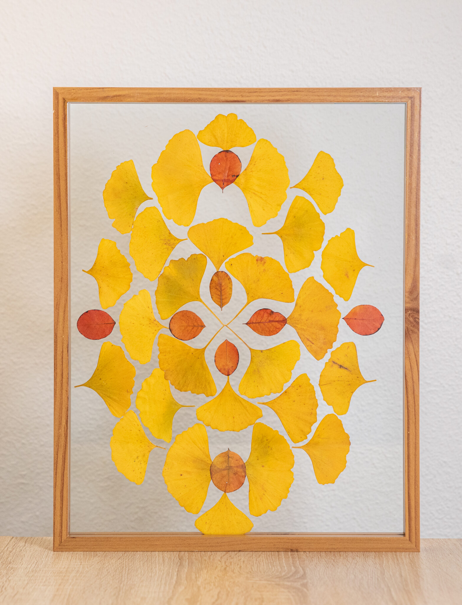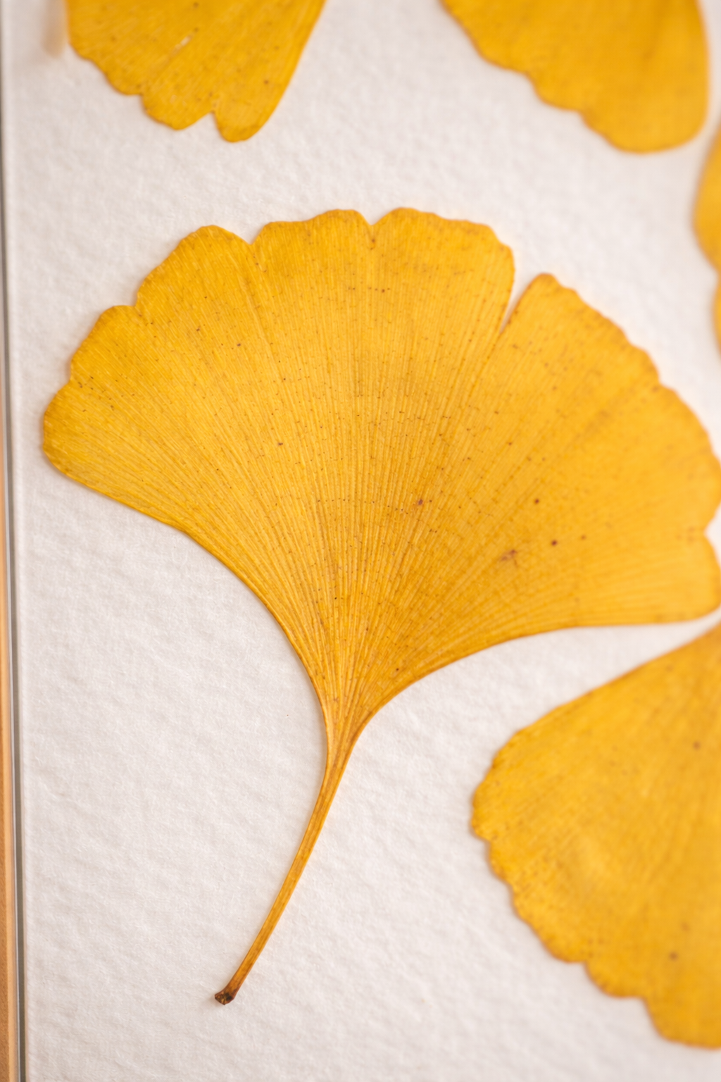 Délicatement disposée avec le plus grand soin, chaque feuille de ginkgo biloba semble figée dans le temps, capturant toute la beauté de l’éphémère et révélant ses détails uniques.