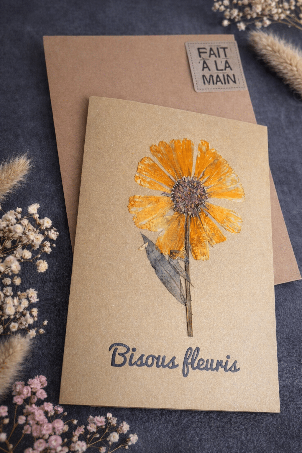 Apportez une touche de poésie et d’émotion à vos mots avec cette carte message réalisée artisanalement à partir de fleurs séchées naturelles.