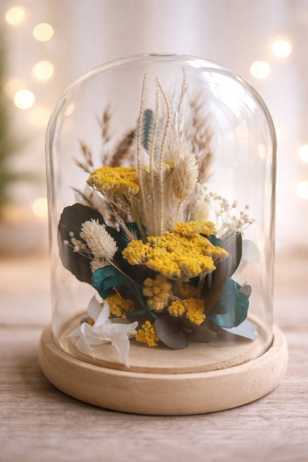Découvrez cette cloche de fleurs séchées et stabilisées aux teintes lumineuses et naturelles.