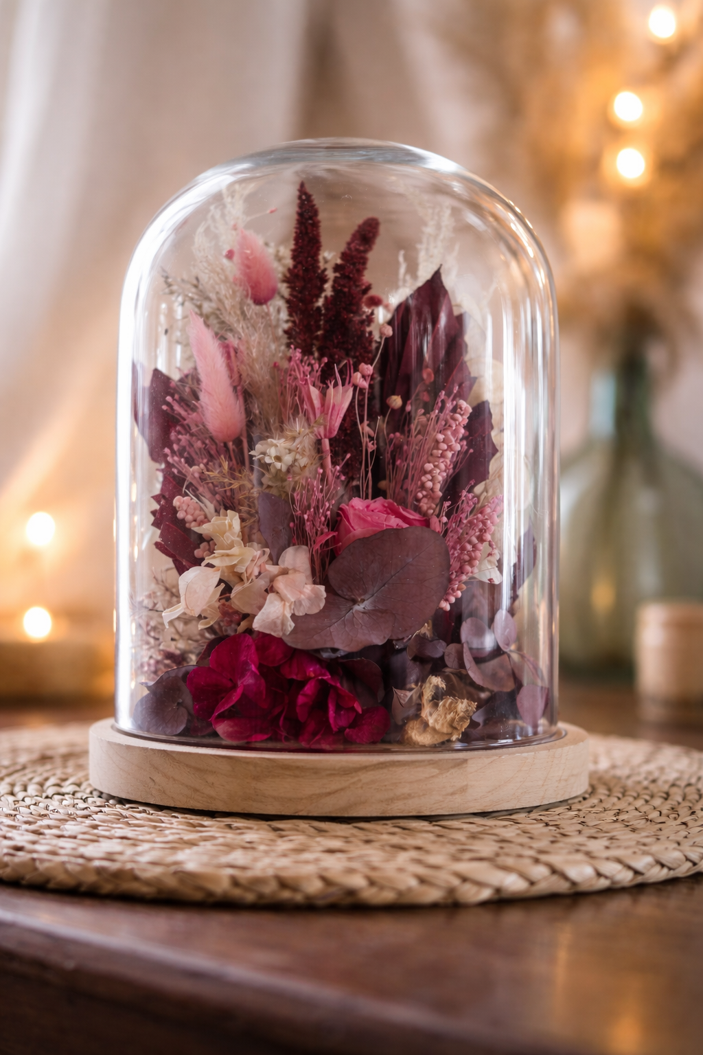 Découvrez cette cloche de fleurs séchées aux teintes profondes et raffinées.
