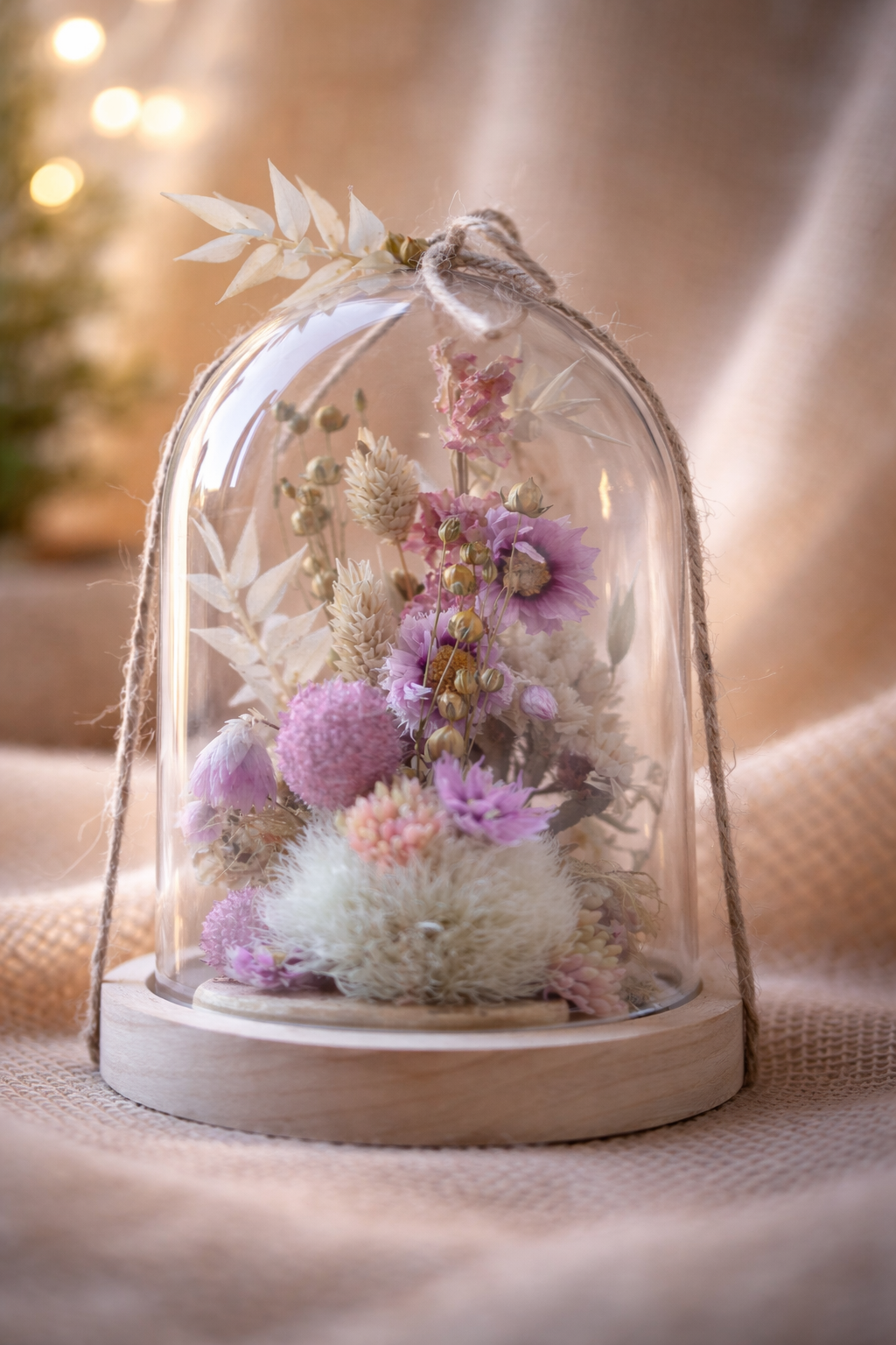 Découvrez cette cloche de fleurs séchées aux teintes douces et poétiques.