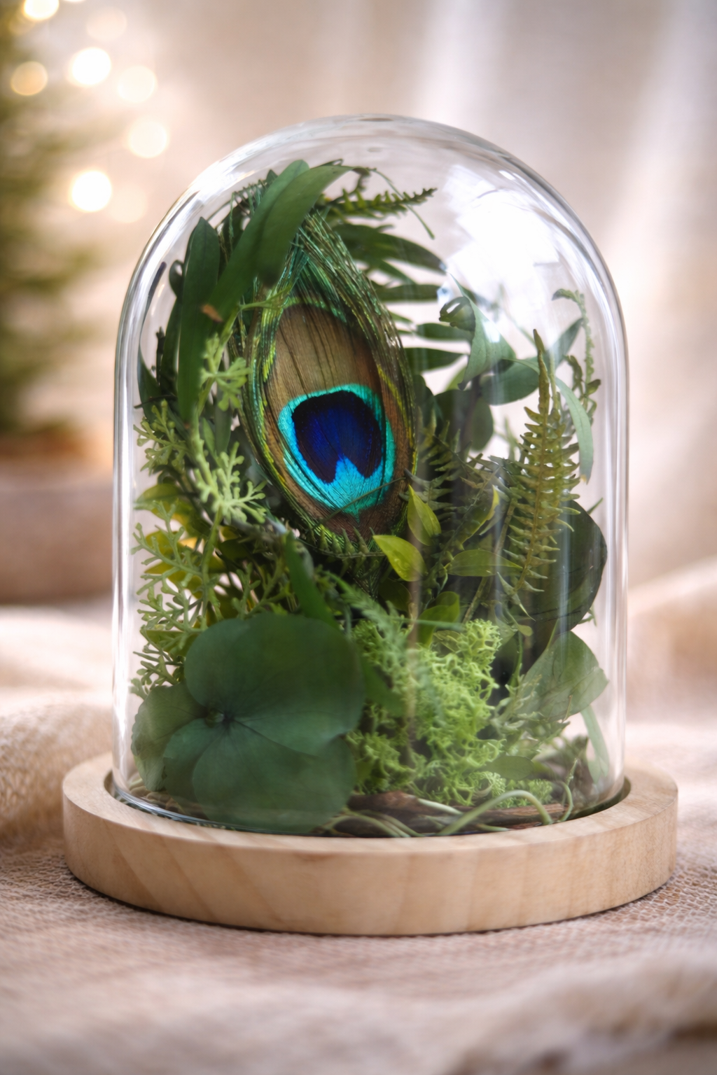 • Composition : plume de paon, feuillage stabilisé, mousse végétale, fougère, eucalyptus et éléments végétaux décoratifs.