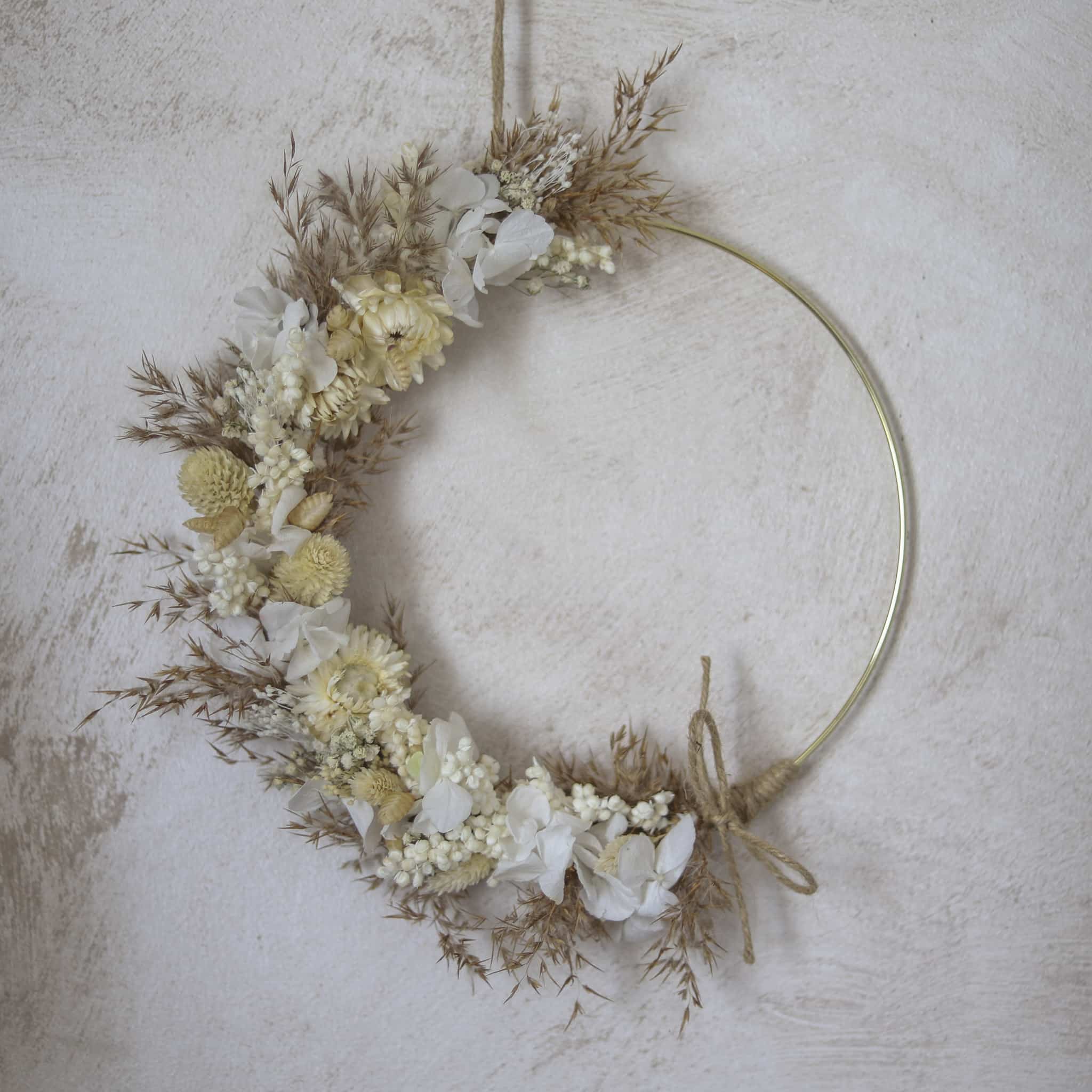 Couronne à suspendre agrémentée de fleurs séchées et stabilisées aux tonalités de blanc et crème : pampa, immortelle, baies et hortensia.
