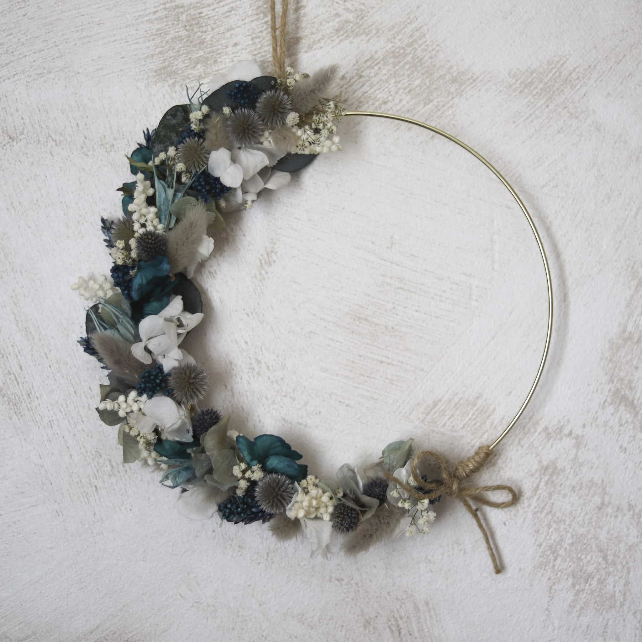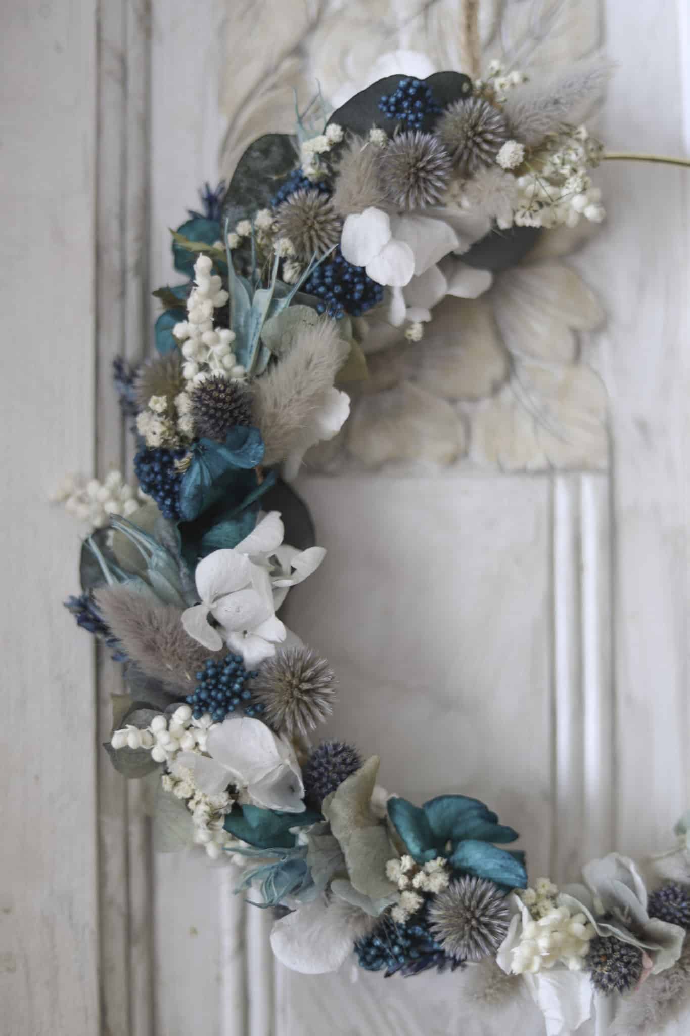 Couronne à suspendre agrémentée de fleurs séchées et stabilisées aux tonalités bleu canard, crème et gris : eucalyptus, hortensia, lagurus, chardon et baies.