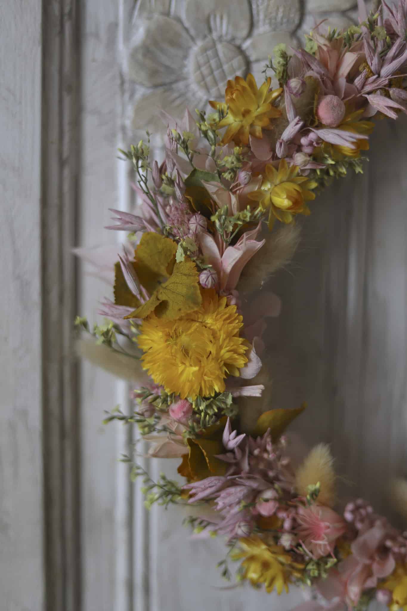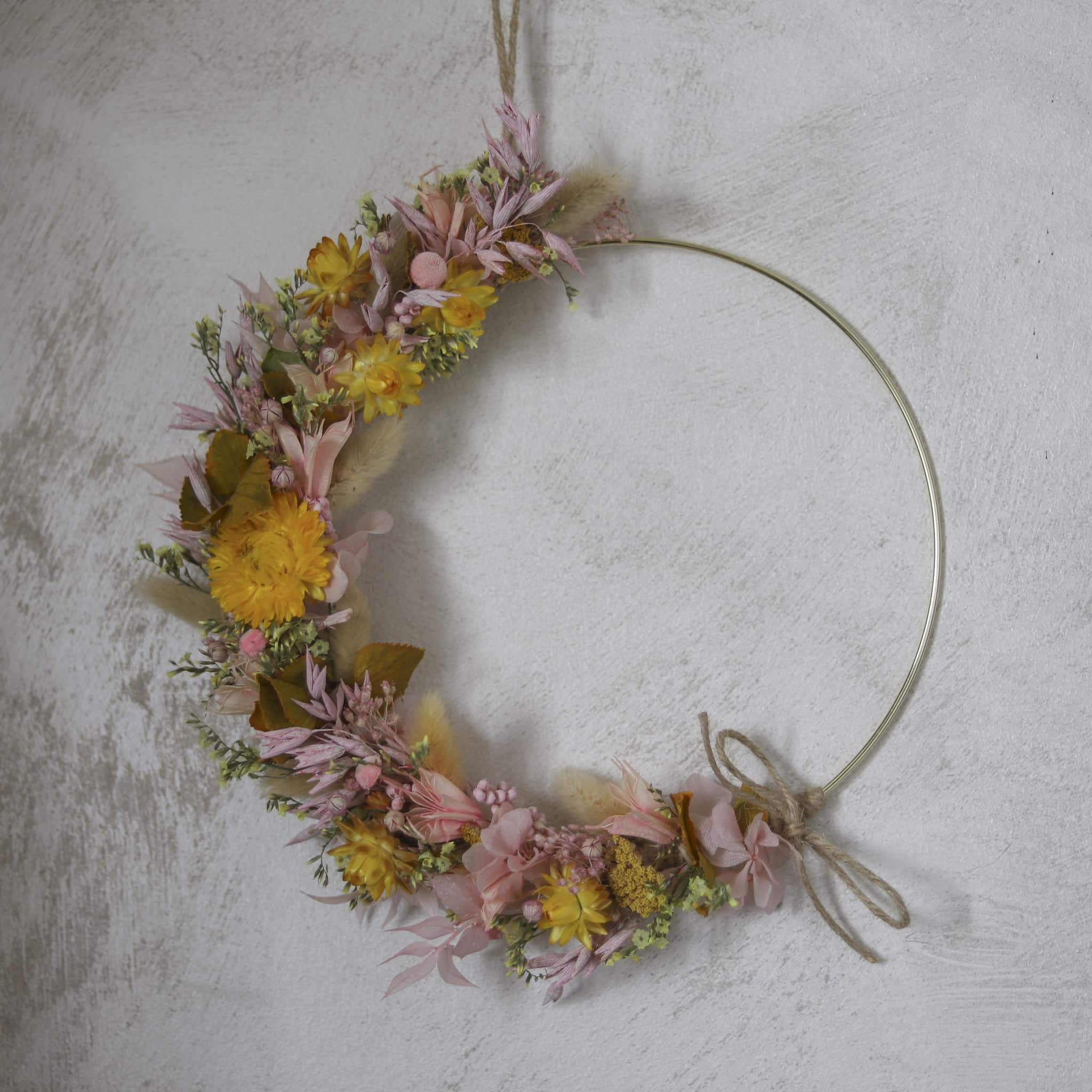 Couronne à suspendre agrémentée de fleurs séchées et stabilisées aux tonalités de jaune et rose poudré : immortelle, ruscus, limonium, et avoine.