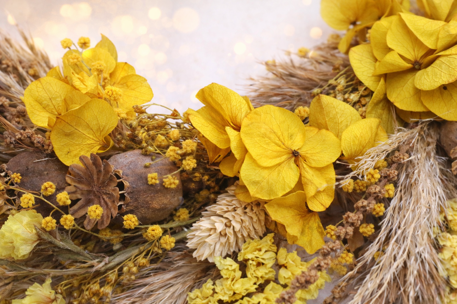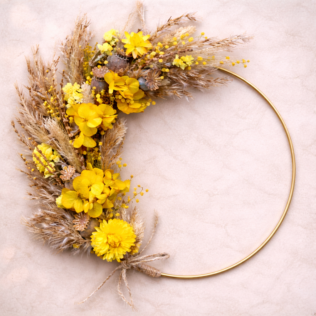 Cette couronne à suspendre est composée de fleurs séchées et stabilisées dans des nuances de jaune doux et de tons naturels. La composition associe différentes textures végétales comme des immortelles jaunes, de l’hortensia stabilisé, des capsules de pavot, du mimosa et des graminées séchées, qui apportent volume et relief à l’ensemble.