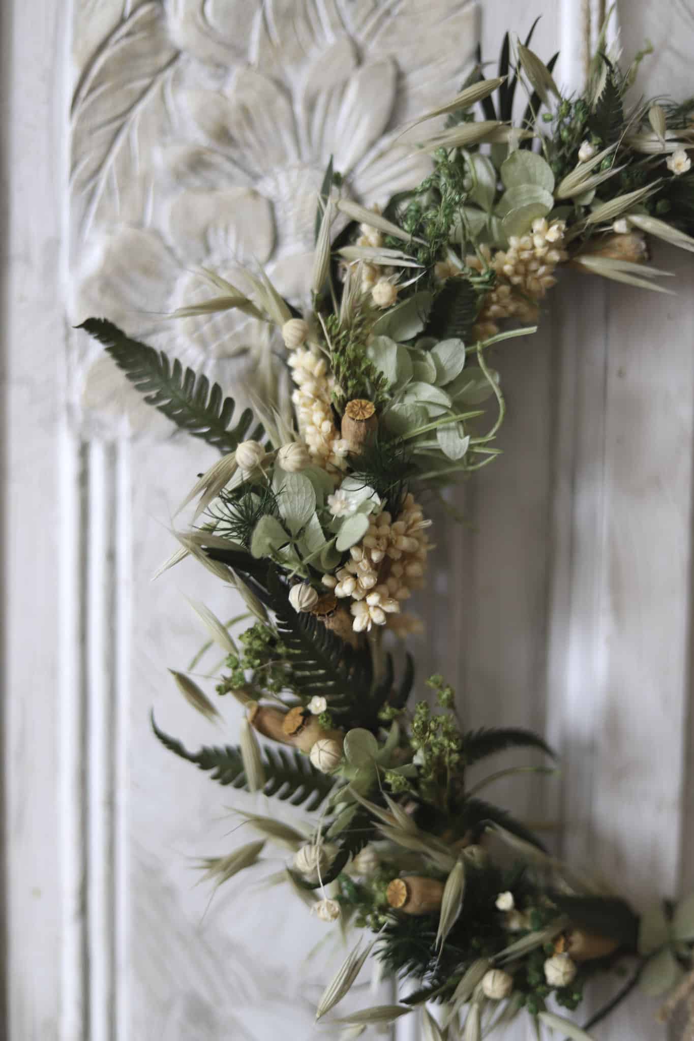 Couronne à suspendre agrémentée de fleurs séchées et stabilisées aux tonalités de vert foncé, vert sauge et crème : fougère, avoine, hortensia et pavot.