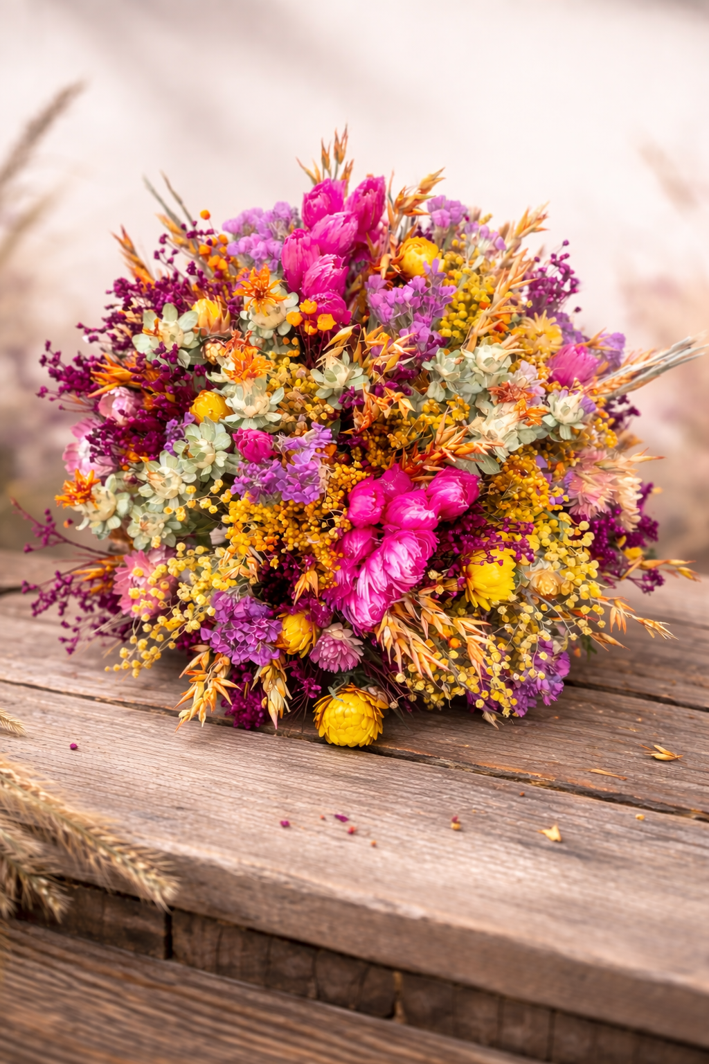 Apportez une touche de poésie et de couleur à votre intérieur avec ce bouquet de fleurs séchées au charme intemporel.