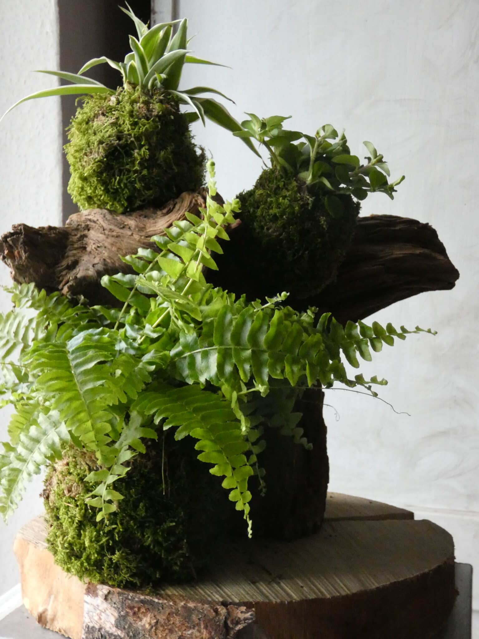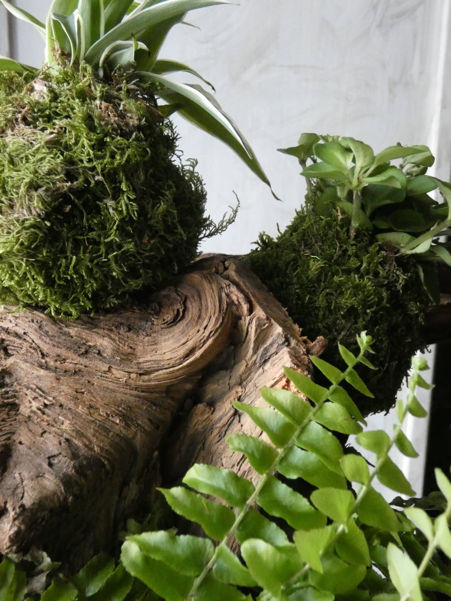 Dans cette création proposée par votre fleuriste, 3 plantes vertes présentée en Kokedama sur leur bois et rondin.