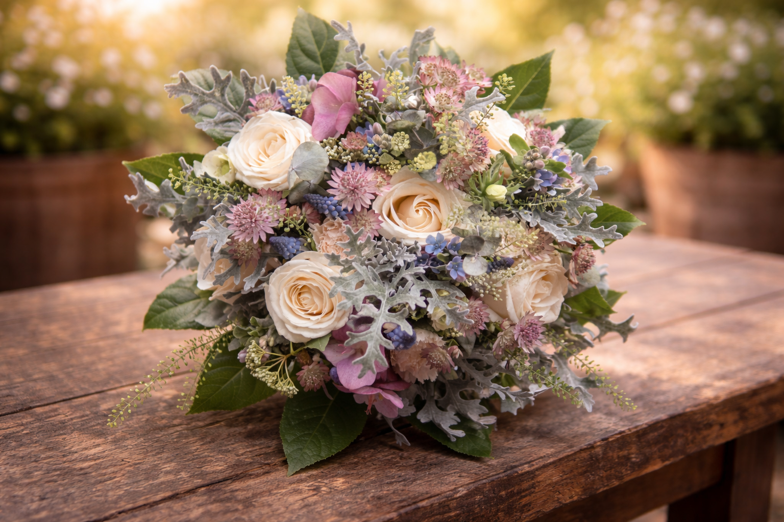 Ce bouquet rond associe eucalyptus, roses, œillets, astrantias, oxypetalums et fleurs de saison dans une composition harmonieuse et aérienne, idéale pour transmettre un message de douceur et d’élégance.