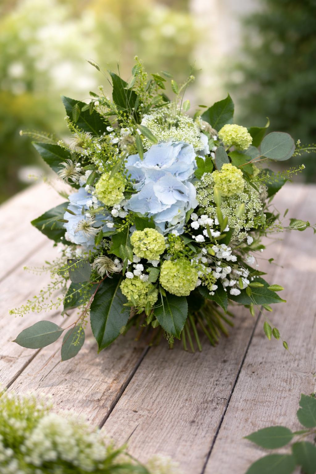 Composé de fleurs de saison soigneusement sélectionnées, telles que l’hortensia aux volumes généreux, le viburnum aux tonalités tendres, du gypsophile et des graminées aériennes, ce bouquet offre un jeu de textures harmonieux et un rendu à la fois naturel et raffiné.