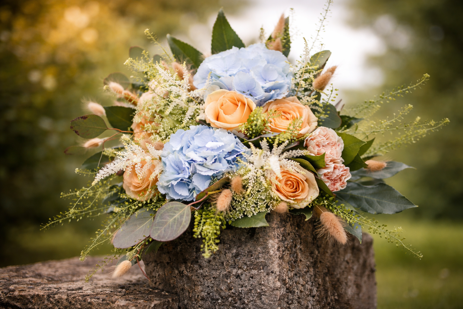 Craquez pour ce bouquet rond aux teintes délicates, où le bleu tendre des hortensias se marie harmonieusement avec les nuances douces et chaleureuses des roses et œillets pêche.