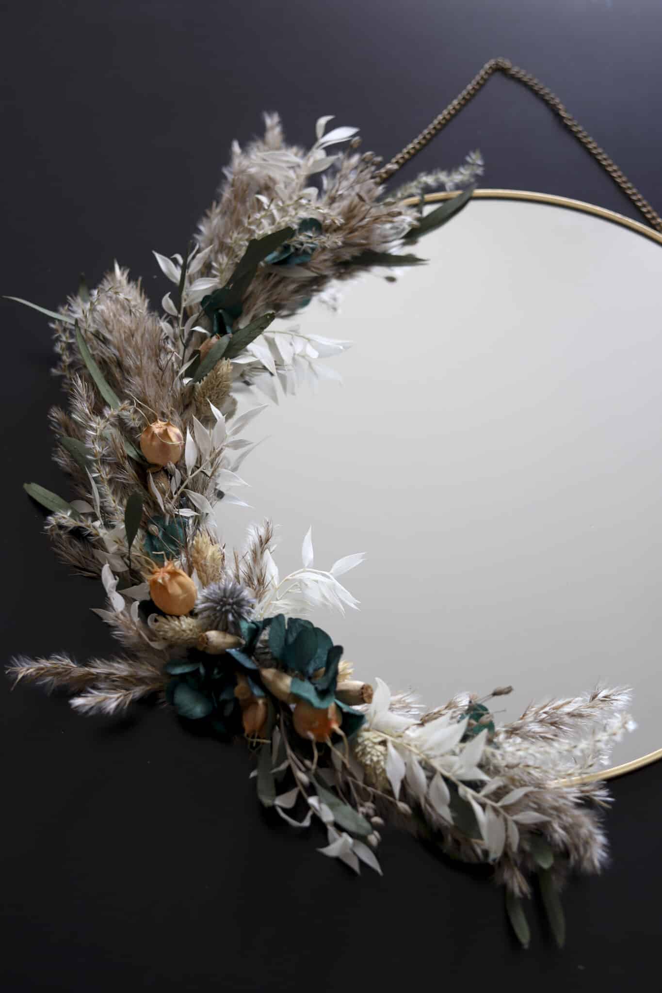 Cet élégant miroir de forme ronde décoré de fleurs séchées donnera une touche légère et poétique à la décoration de votre intérieur.