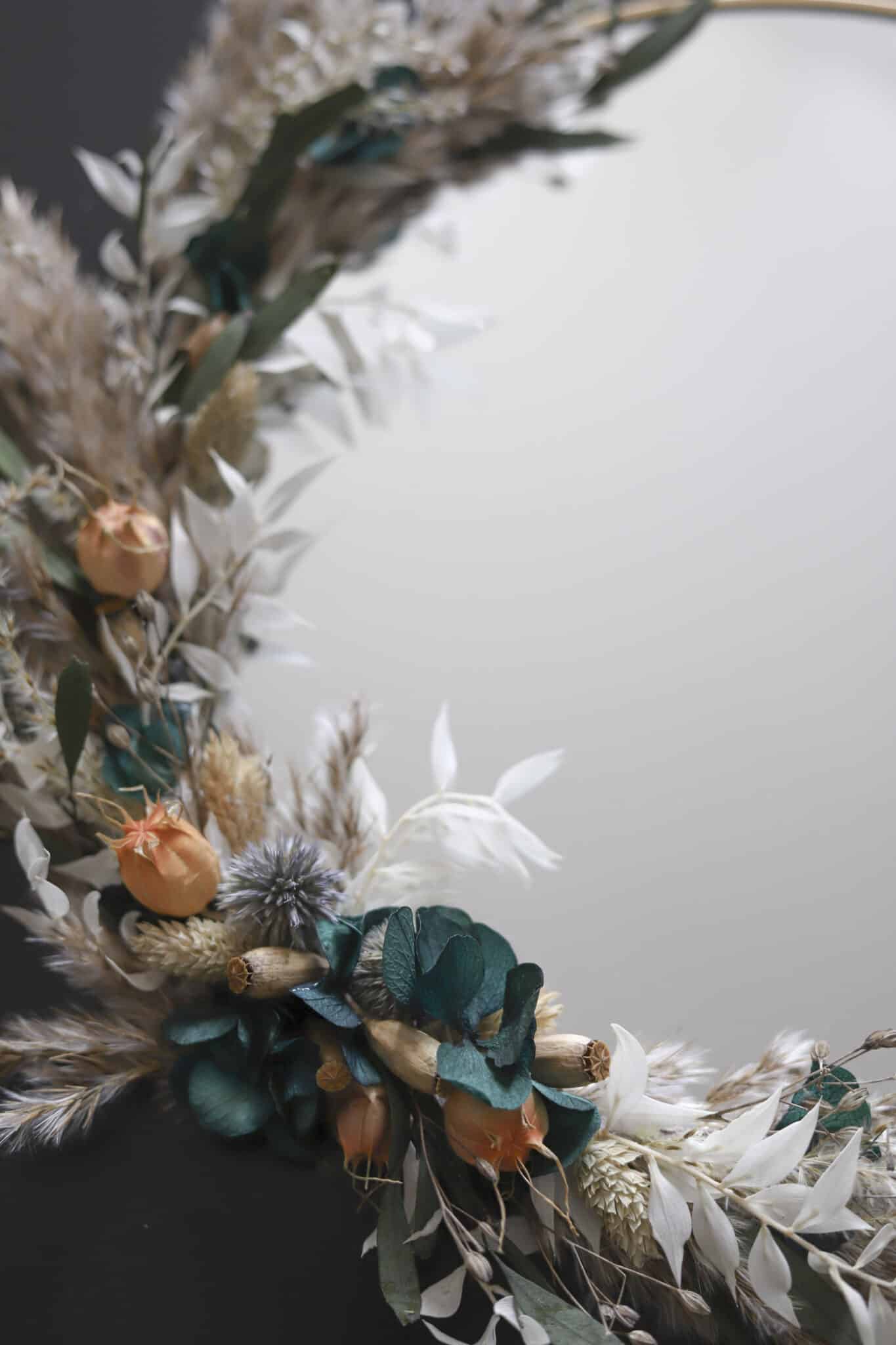 Entièrement réalisé à la main avec des fleurs stabilisées et séchées dans les tons naturels : ruscus, pampa, chardon, pavot, phalaris, nigelle, asparagus et hortensia bleu canard.