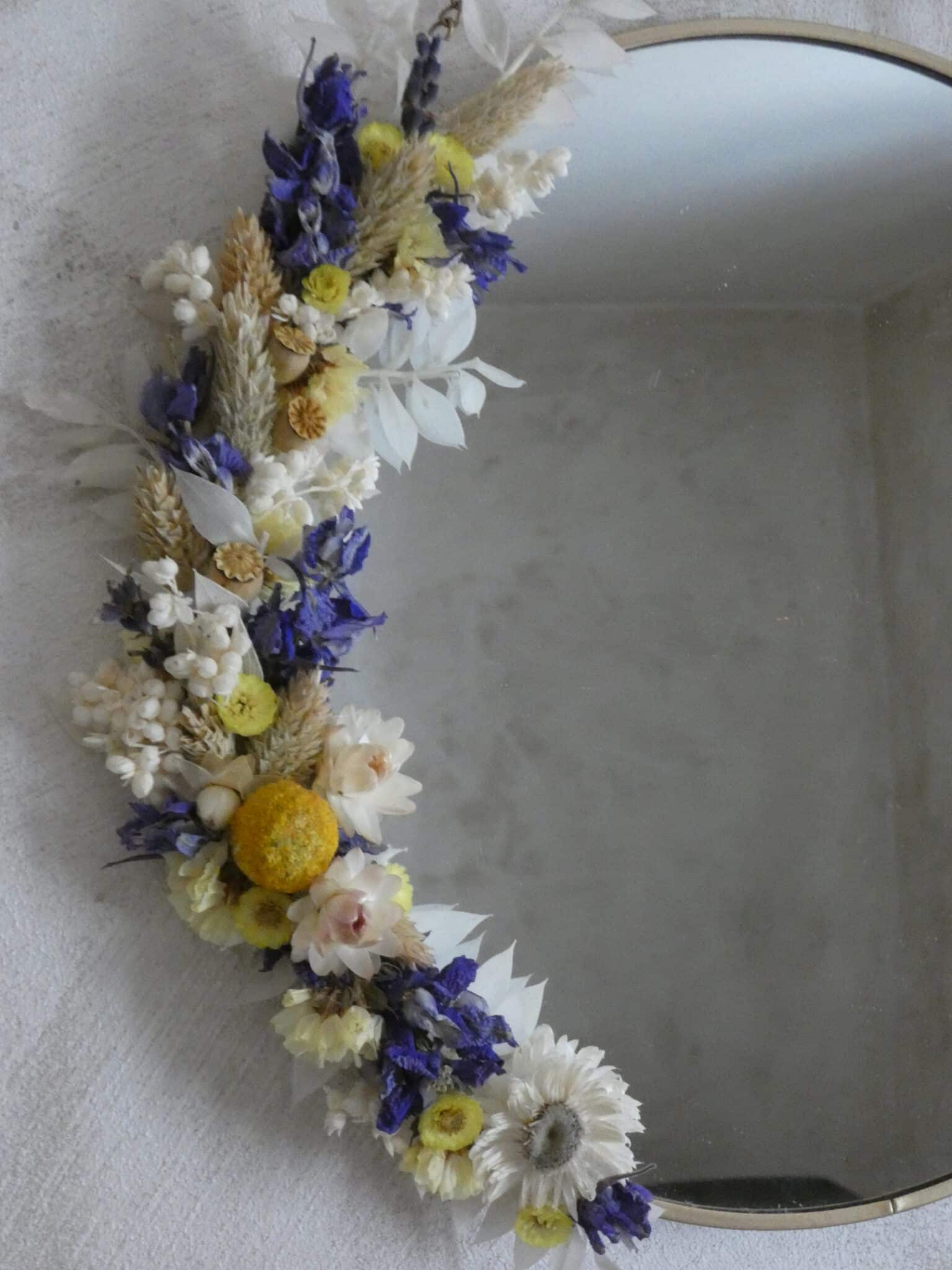 Cet élégant miroir de forme ronde décoré de fleurs séchées donnera une touche légère et poétique à la décoration de votre intérieur.