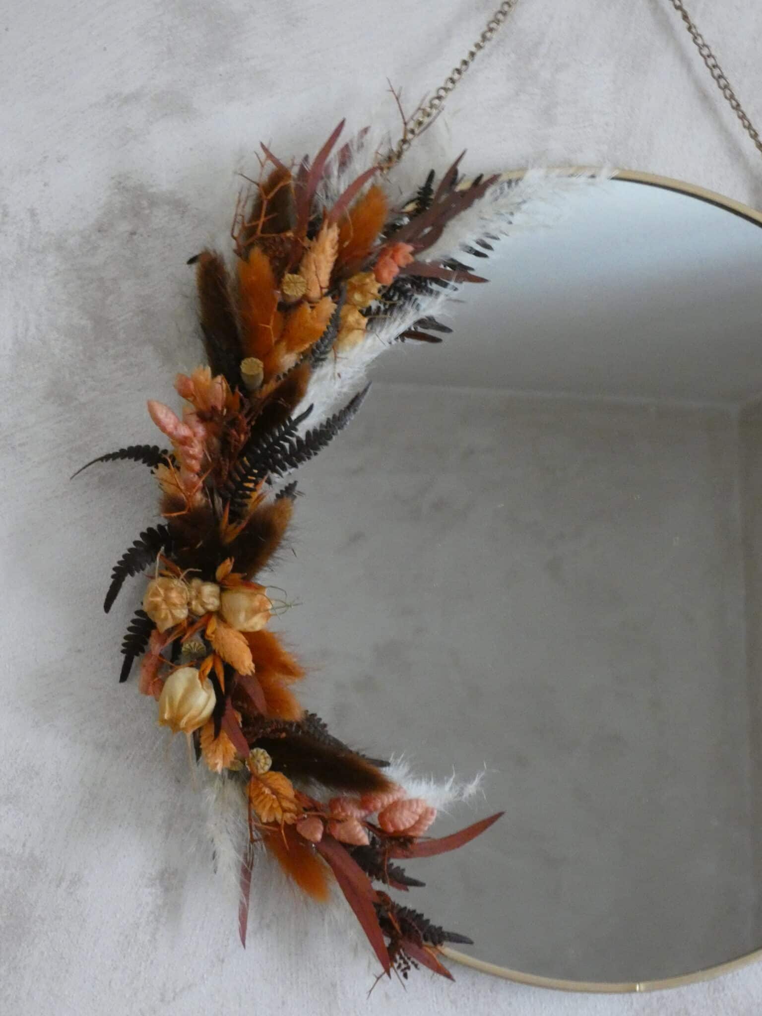 Cet élégant miroir de forme ronde décoré de fleurs séchées donnera une touche légère et poétique à la décoration de votre intérieur.